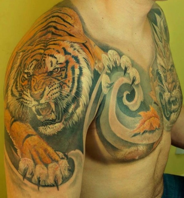 半甲亚洲风格的五彩写实老虎龙纹身图案