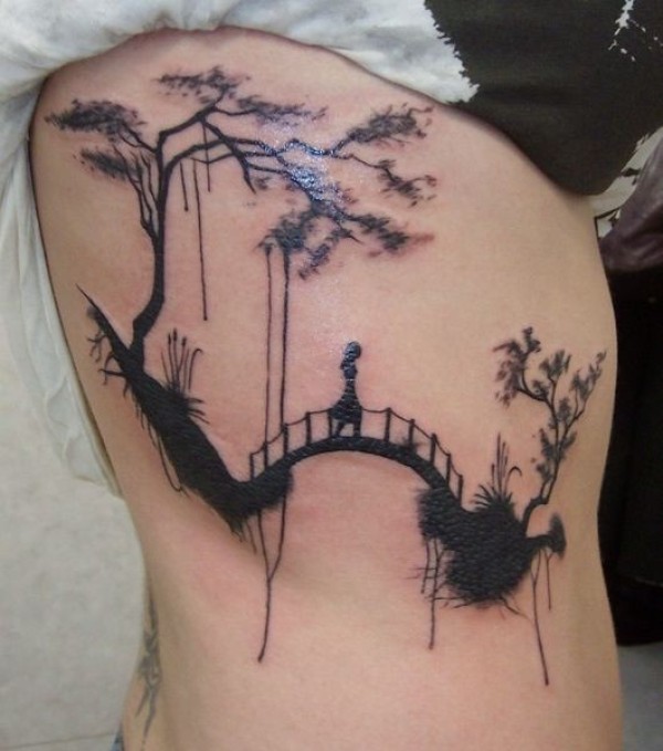 侧肋亚洲风格黑色孤独的人和桥纹身图案