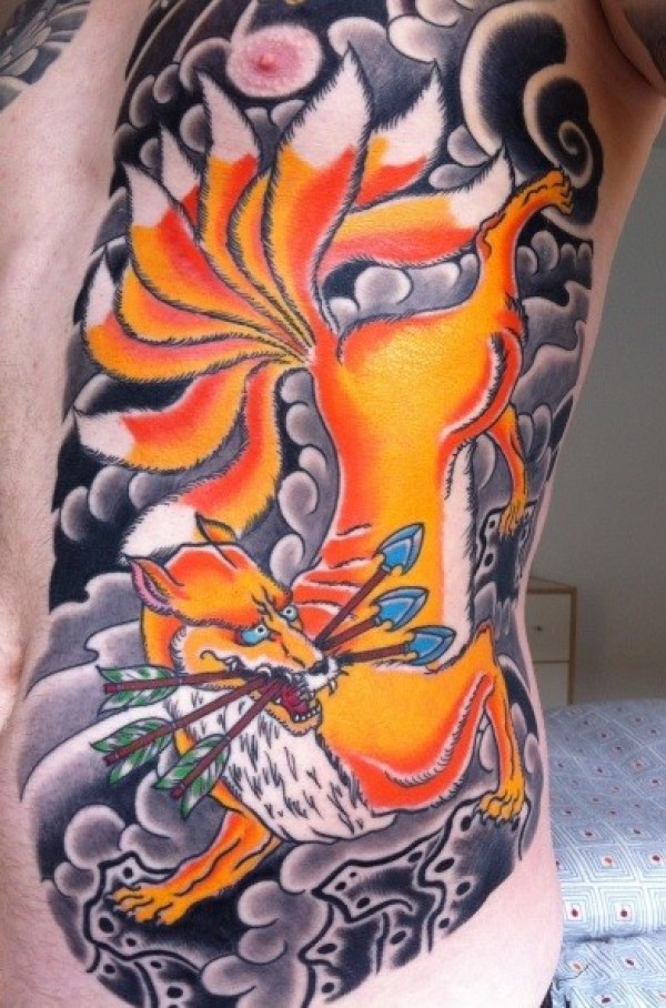 胸部亚洲风格的彩色邪恶九尾狐纹身图案