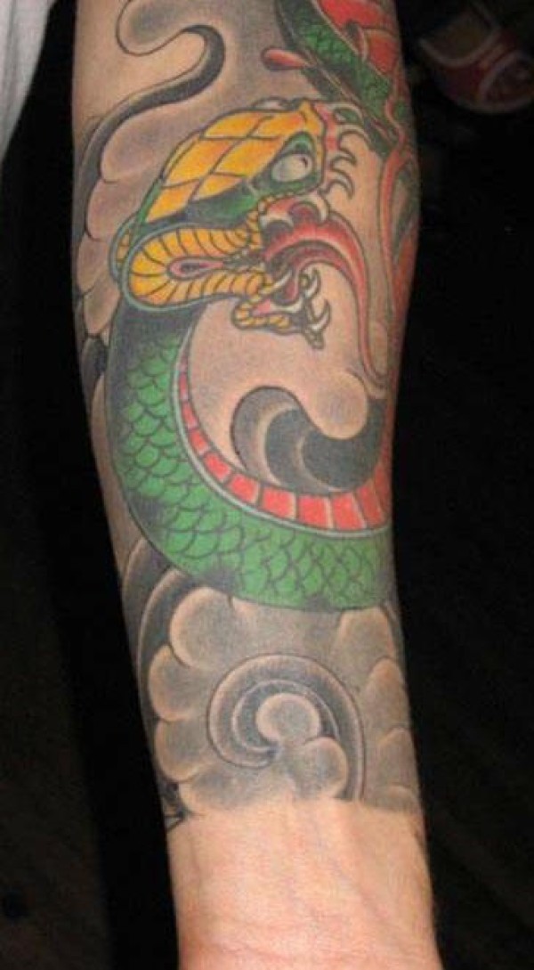 手臂亚洲风格的彩色蛇纹身图案