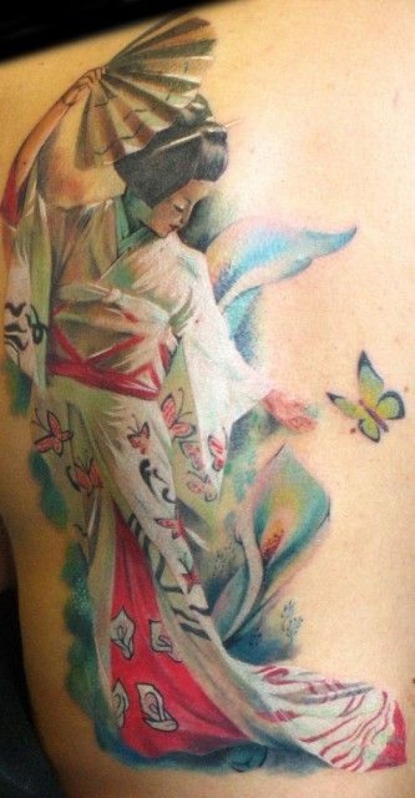 背部亚洲风格五彩的艺妓花卉和蝴蝶纹身图案