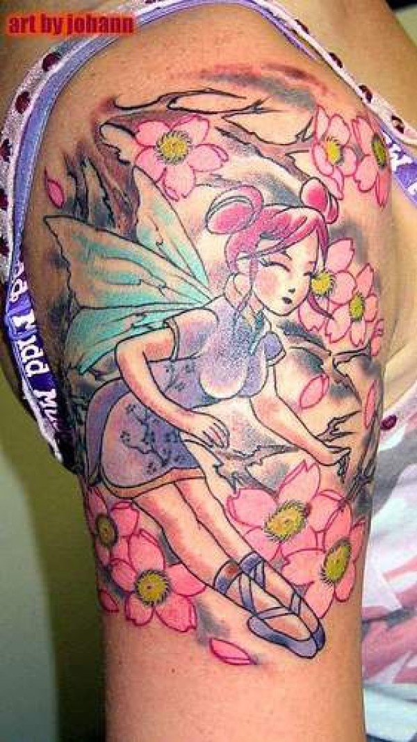 樱花树下的亚洲精灵纹身图案