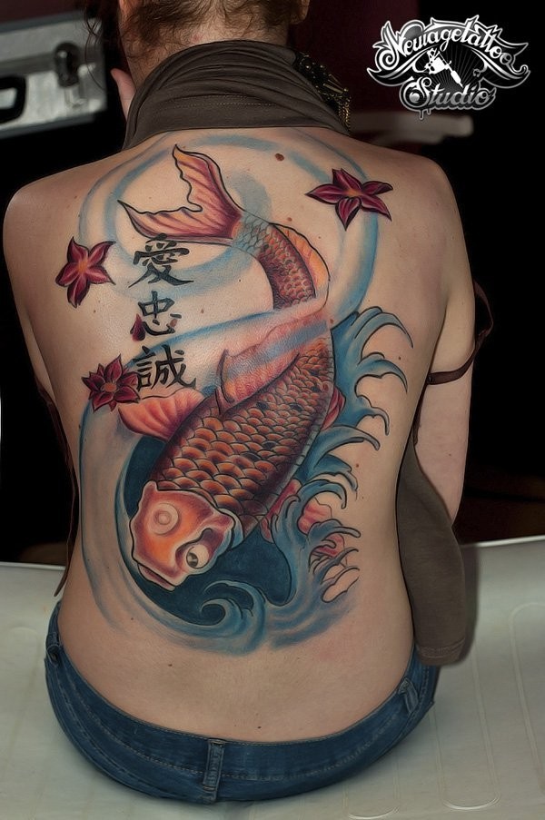 背部亚洲风格的彩色鲤鱼花朵字母纹身图案