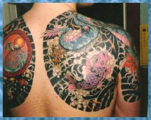 背部黑色风格的锦鲤鱼纹身图案