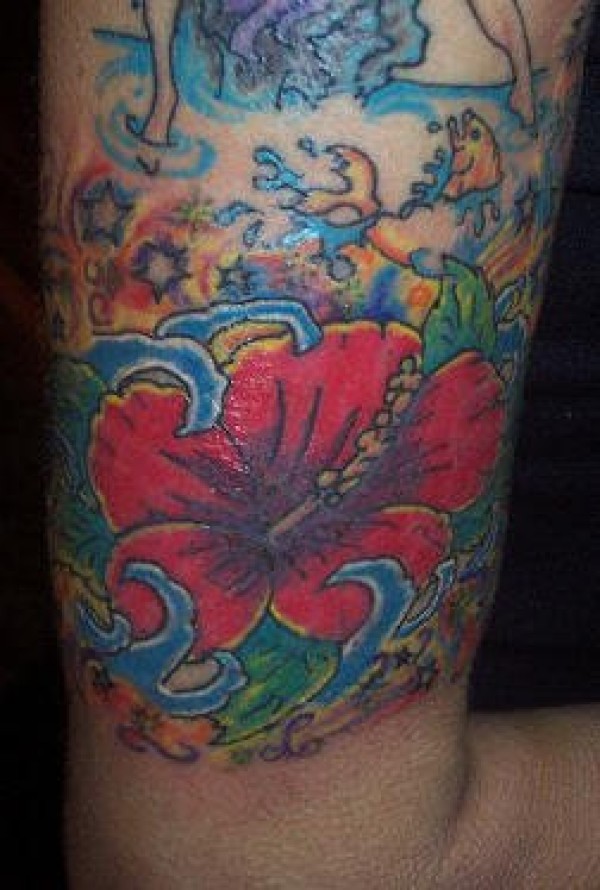 手臂彩色亚洲风格的红芙蓉纹身图案
