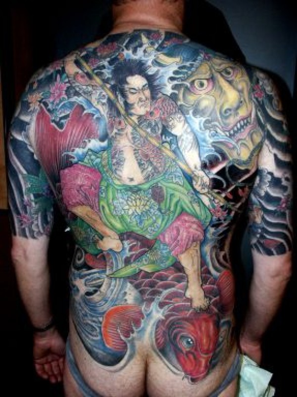 满背亚洲风格武士般若和鲤鱼彩绘纹身图案
