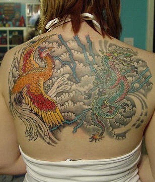 女生背部彩色亚洲风格龙和凤凰纹身图案