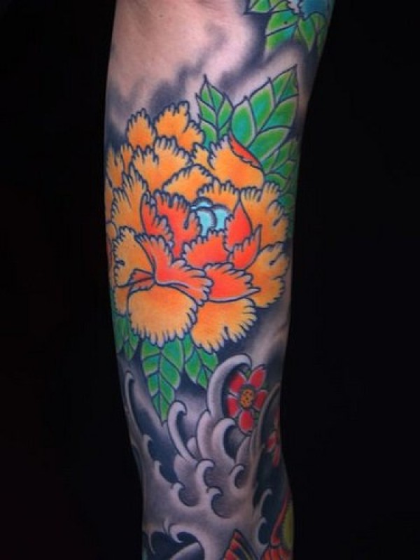 手臂橙色的牡丹花纹身图案