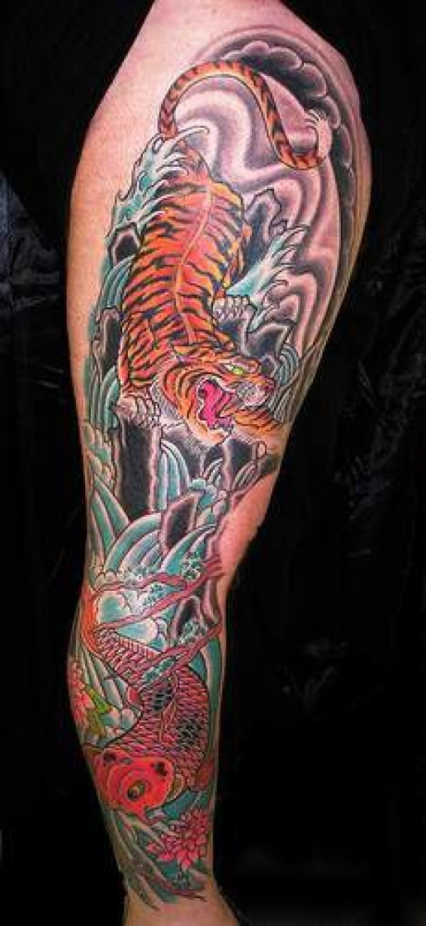 手臂彩色的锦鲤鱼和亚洲虎纹身图案