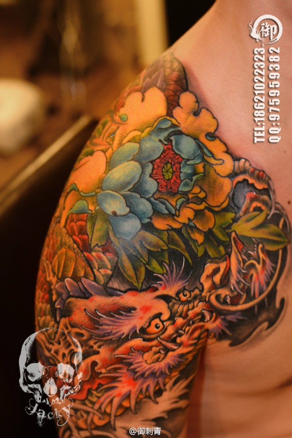 传统过肩龙搭配代表富贵的牡丹遮盖修改客人原本的大图腾