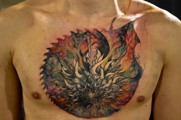 男性胸部彩色的花朵与华丽的装饰纹身图案