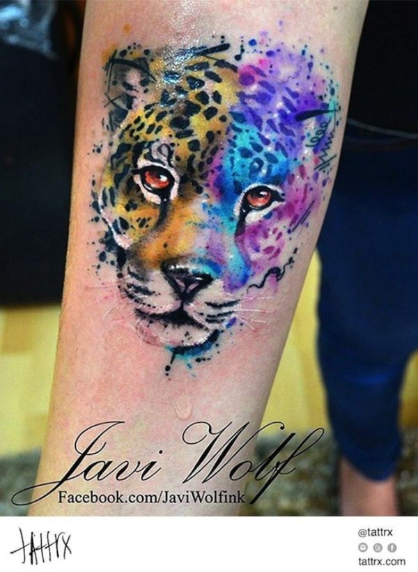 手臂水彩风格泼墨豹子头像纹身图案