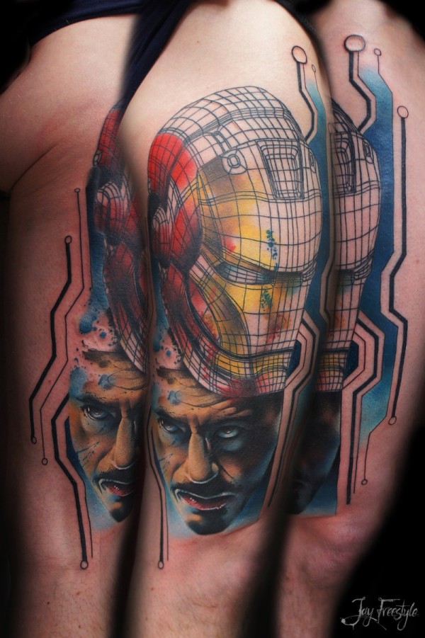 大腿彩绘头盔和逼真的男性肖像纹身图案