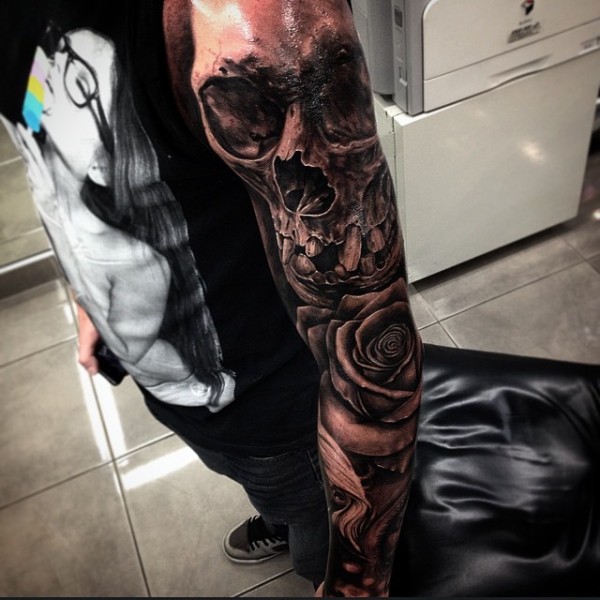 手臂写实的黑白骷髅和玫瑰纹身图案