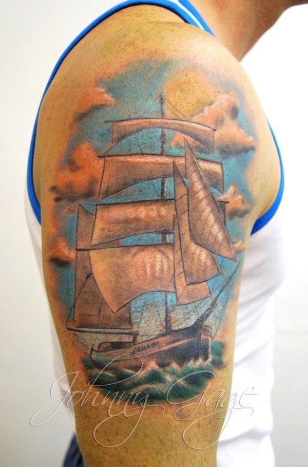 大臂卡通风格彩色的帆船纹身图案