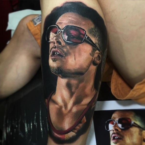 小腿写实风格彩色男子肖像与太阳镜纹身图案