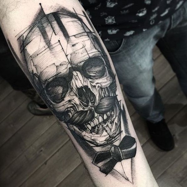手臂素描风格骷髅胡子和蝴蝶结纹身图案