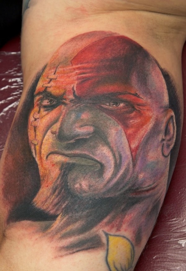 大臂内侧彩色的邪恶野蛮人肖像纹身图案