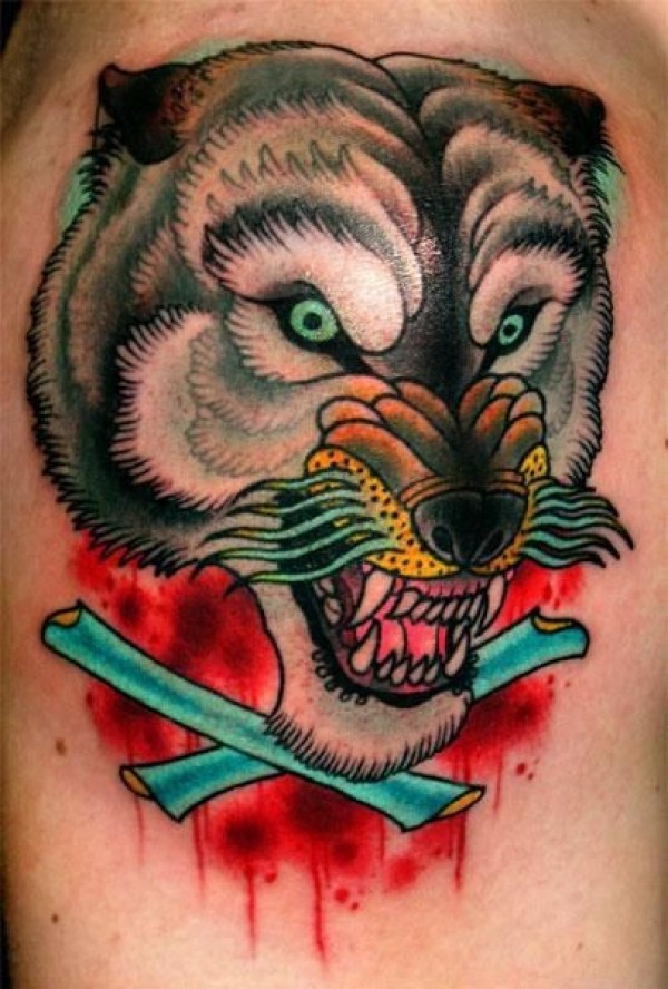 大臂五彩的恶兽与交叉的骨头纹身图案