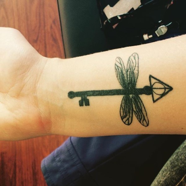 手腕上神秘的蜻蜓形钥匙黑色纹身图案