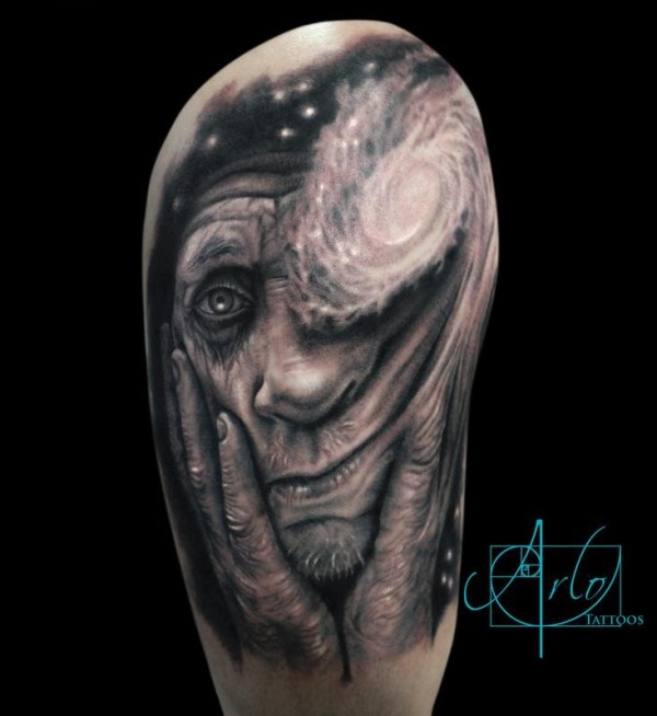 大臂黑色的悲伤老女人肖像与星空纹身图案