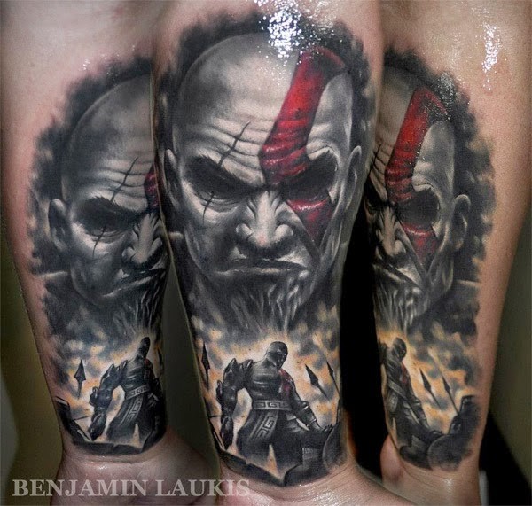 手臂很棒的设计彩色邪恶野蛮人纹身图案
