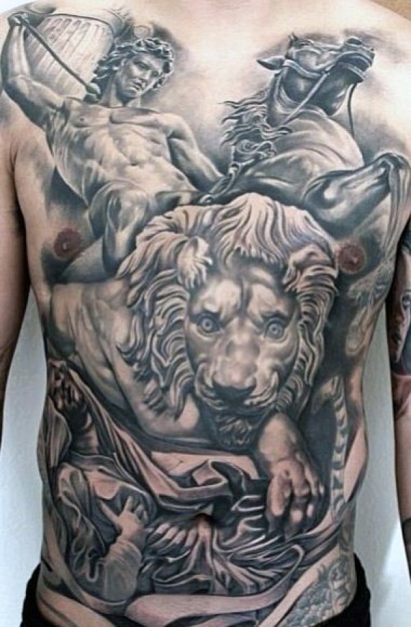 胸部和腹部很棒的古希腊勇士和狮子纹身图案
