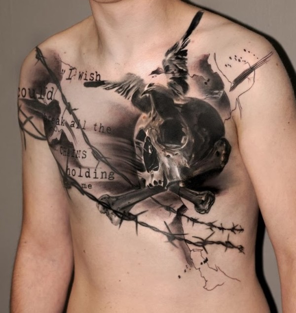 胸部骷髅骨头与字母鸽子纹身图案