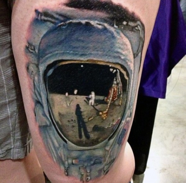 大腿写实的彩绘宇航员在月球纹身图案
