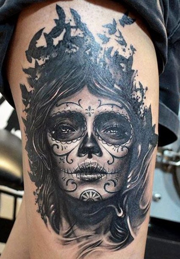 大腿黑灰色的小鸟和死亡女郎纹身图案