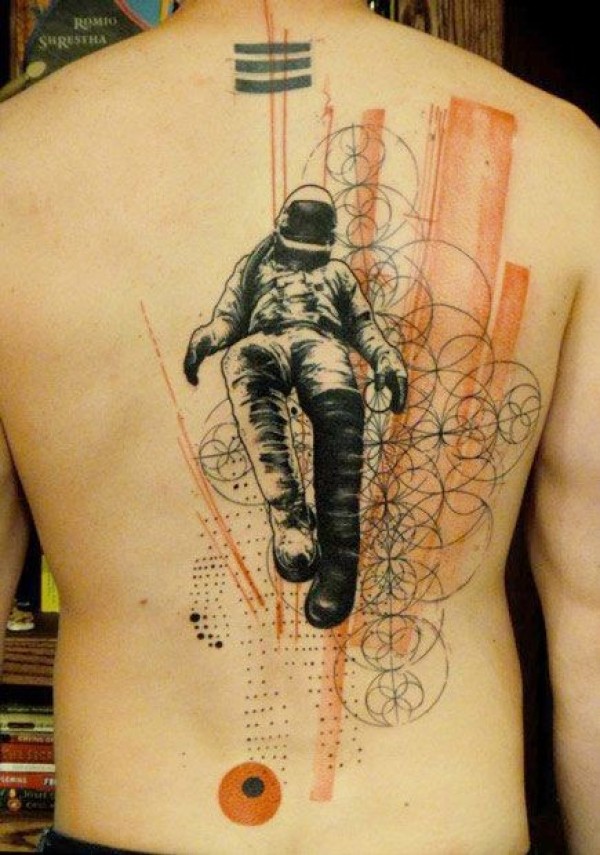 背部宇航员和神秘圆形装饰纹身图案