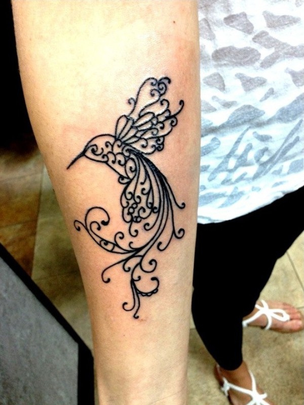 小臂卷曲的黑色藤蔓小鸟纹身图案