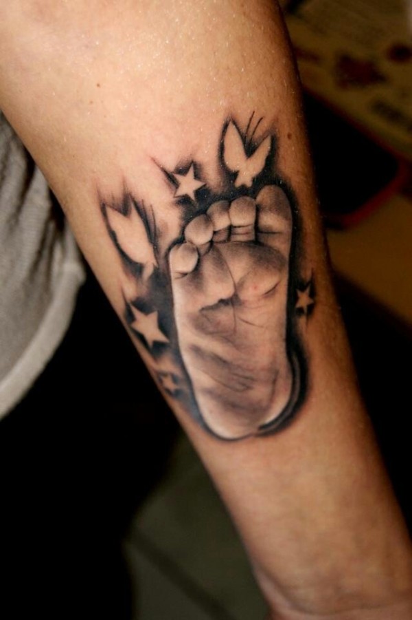 手臂蝴蝶和星星婴儿脚印纹身图案