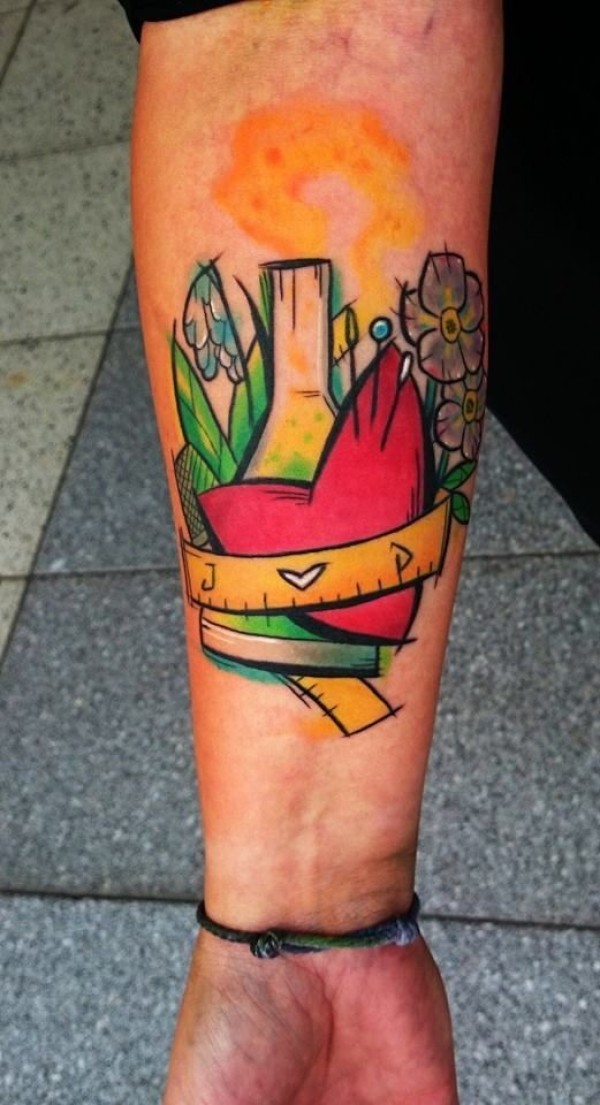 手臂鲜艳的彩绘心形花朵瓶子纹身图案