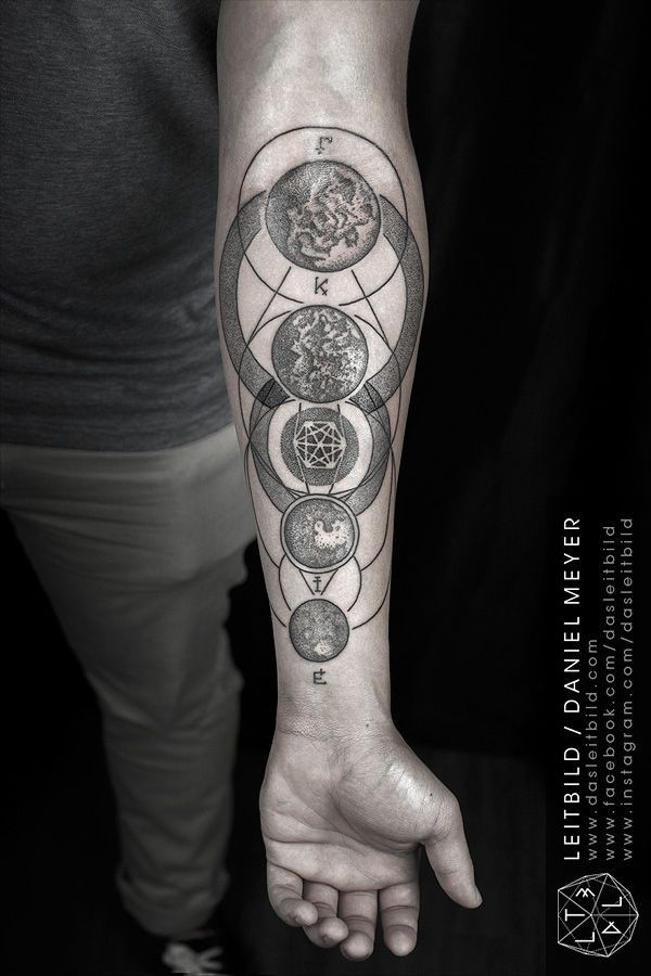 手臂行星和几何符号点刺纹身图案