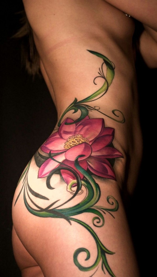 女生侧肋彩色的异国花卉纹身图案