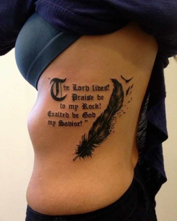 侧肋黑色鸟羽毛和哥特字母纹身图案