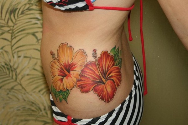 腰部橙色的夏威夷花朵纹身图案