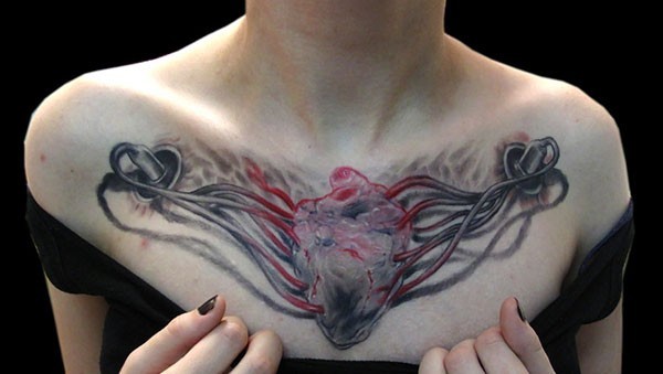 女性胸部写实的彩绘心脏纹身图案