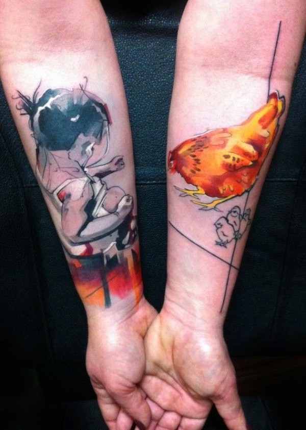 手臂色彩鲜艳的母鸡和小孩子纹身图案