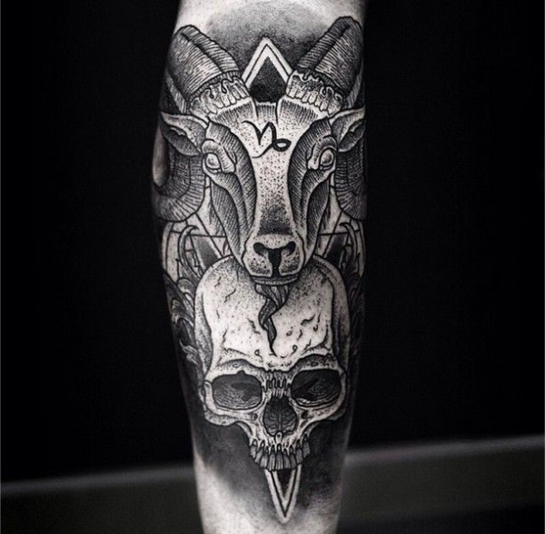小臂黑色点刺的山羊头颅骨和骷髅纹身图案