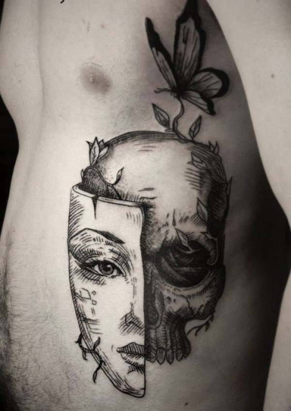 侧肋黑灰色骷髅与面具纹身图案