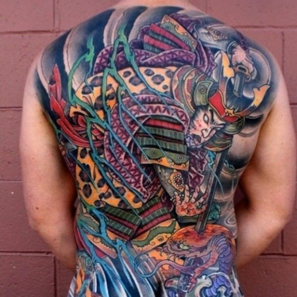 满背彩色的日本武士纹身图案