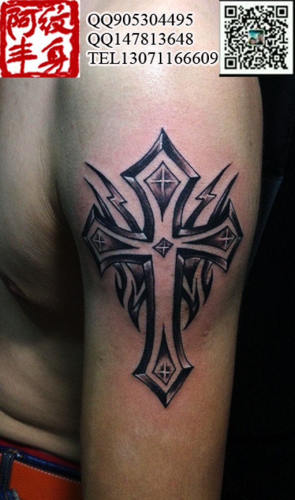 肩部十字架纹身图案时候比较瘦的纹身爱好者 阿丰纹身作品