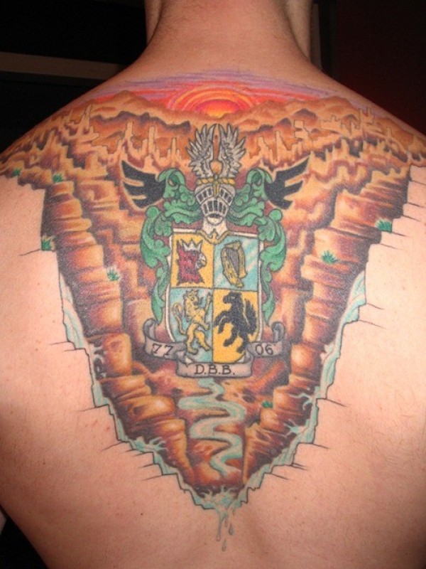 背部彩色的家庭徽章纹身图案