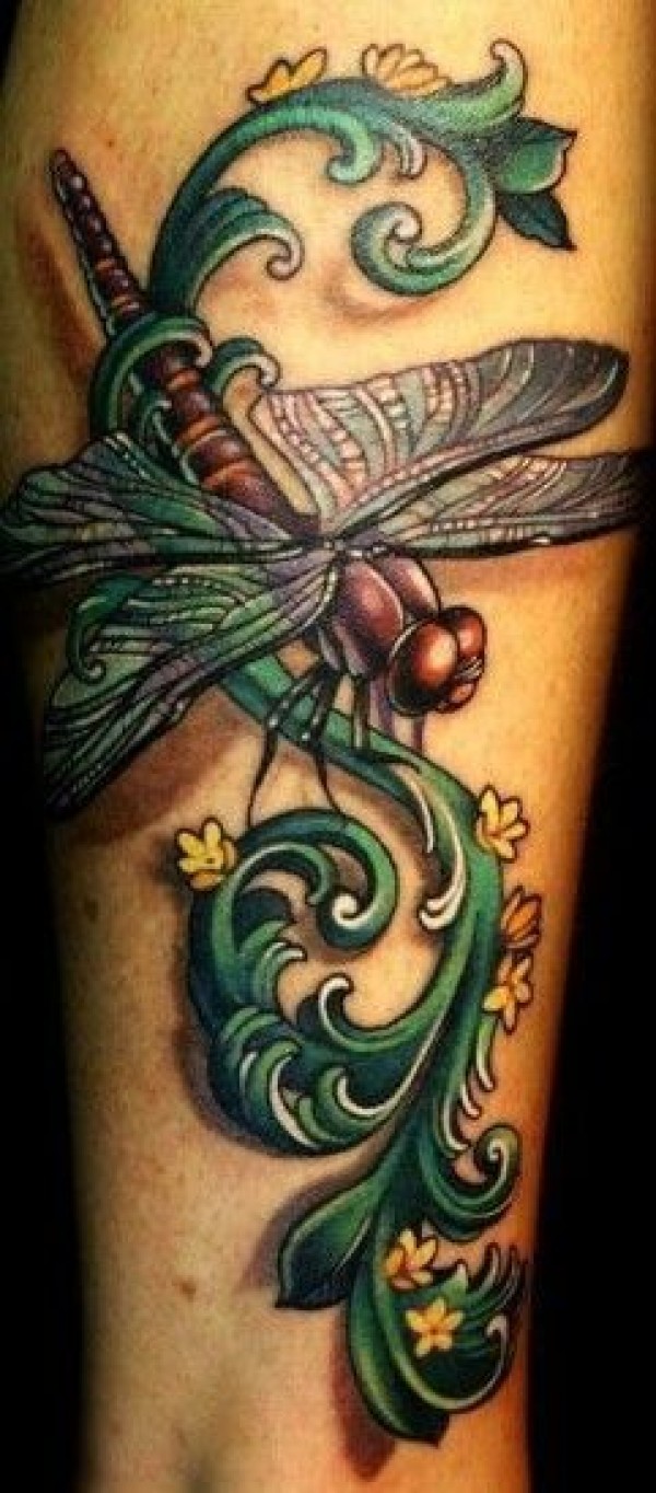 彩色逼真的蜻蜓花卉纹身图案