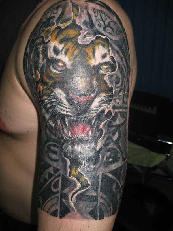 大臂彩色的老虎头像纹身图案