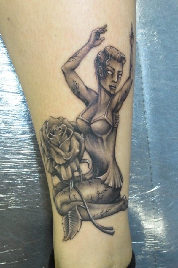 小腿僵尸女孩和玫瑰纹身图案