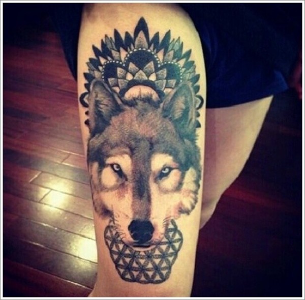 大腿狼头像与黑色梵花纹身图案