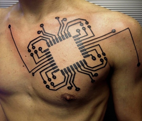 胸部的电脑电路黑色纹身图案